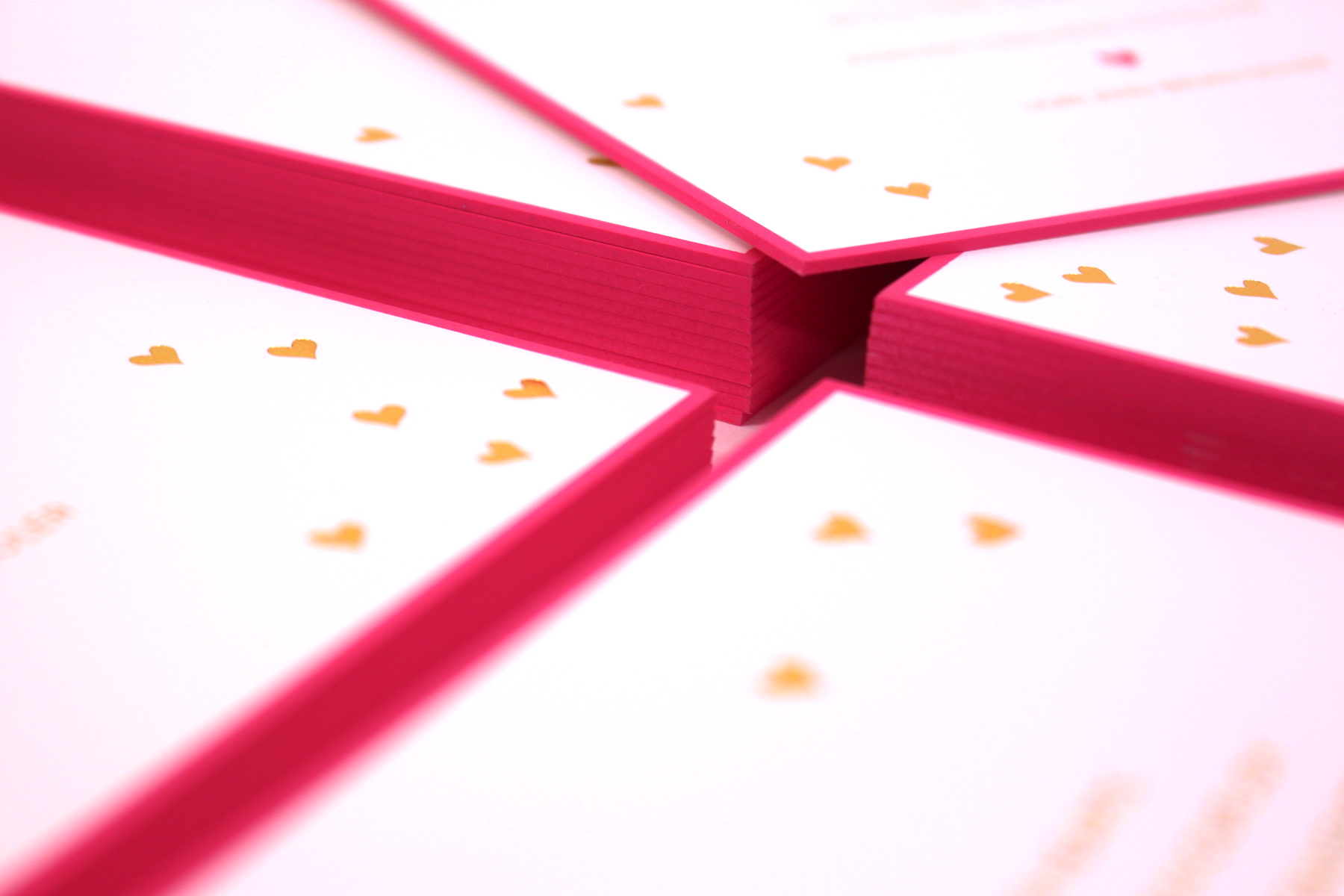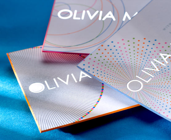 Most are familiar with the gold or silver edging on the pages of bibles. This is commonly known as gilding and is accomplished using heat and gold foil. Here at Exclusive Bordering Company we simulate this process and call it Edge Coloring. It has also been referred to as faux gilding, edge tinting, edge painting or edge inking. With Edge Coloring we are not limited to gold, silver or metallic colors. Our craftsmen can apply any color from jet black to the lightest pastels. From white to glitters. These finishes can be applied onto the edge of almost any sheet, card, pad or book. We even color the edges of acrylic which can give you a really funky looking invitation.