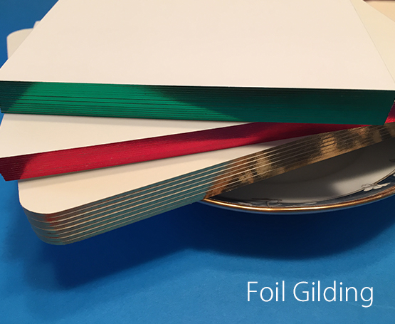 Most people are familiar with the gold or silver edges on the pages of fine books or bibles. This craft is known as gilding and is as old as ancient Egypt. True gilding is the application of a very thin film of gold or silver to an object to give it luster and brilliance. Today, we at Exclusive Bordering Company, use gold or silver foils to embellish the edges of books, invitations, announcements, business cards, etc. Adding gilded edges to your printed piece not only embellishes it but ads value as well. Along with several shades of lustrous golds and brilliant silvers your foil choices also include reds, greens, blues, and more. We also offer holographic foils which adds that dimensional, shimmering, 3D look. Contact our customer service department today and let us help you create your next masterpiece.