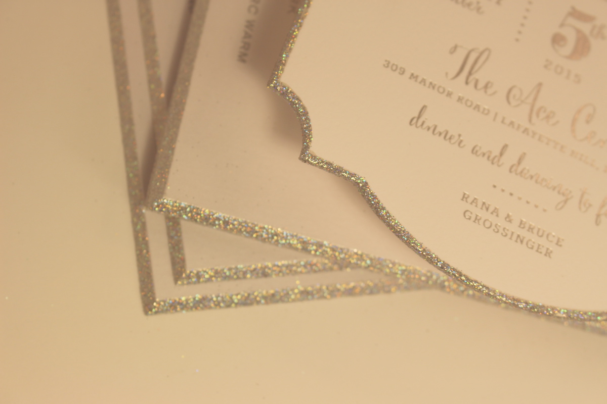 Our newest border application at Exclusive Bordering Company is Glitter Edging. A shimmering border of glitter around either 1, 2, 3, or all four edges of the sheet will prove to be a sparkling embellishment to any stationery, invitation or announcement. Normally people choose a wider border of glitter (up to 1/8″) because the narrower the glitter border is, the less noticeable it is. And as we all know… Bling is where it’s at!