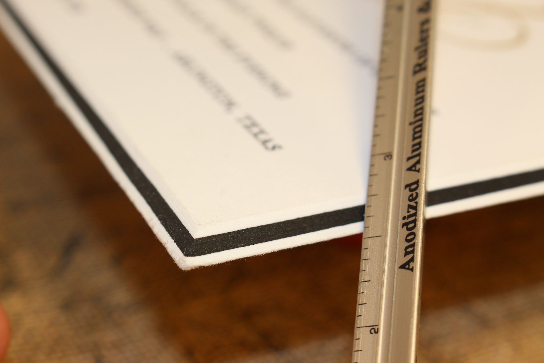 However, if a much thicker piece is desired we can “sandwich” in between the top and bottom sheets, a filler sheet if needed. This can be more of the same paper as the top sheet so when we final trim or bevel the edge, the entire sheet will look like it is all one, heavy, ultra thick board.