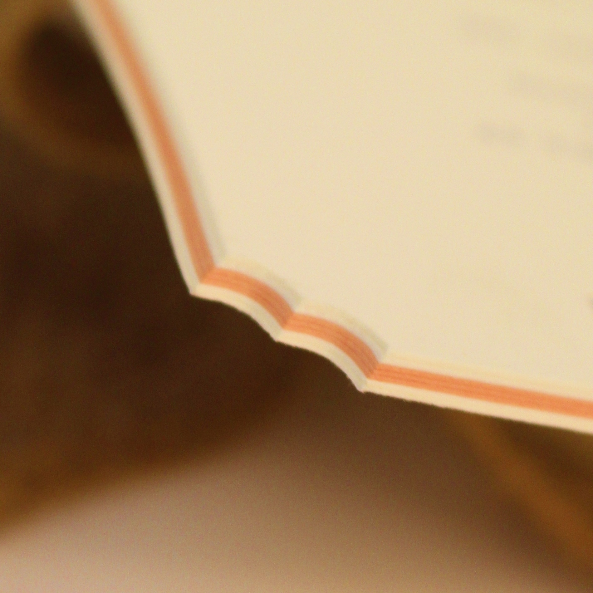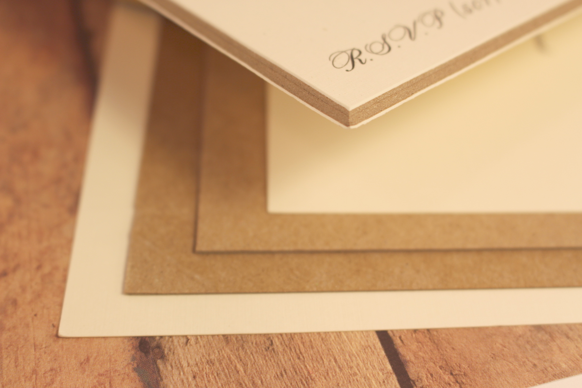 Laminating, layering or pasting is the process of taking multiple sheets of paper or card stock and “pasting” them together. Today’s appealing and trendy look is the “heavy” or “thick” paper used largely in the wedding and announcement industry. Nowadays, popular announcements, invitations, etc. can be anywhere from double thick cover stock up to 1/6″ or even thicker. Most paper mills don’t make a sheet that heavy so in order to achieve this thickness we at Exclusive Bordering Company can laminate or paste several pieces together to attain your desired thickness. Depending on the final selected appearance, there are several options to choose from when deciding your laminating possibilities.