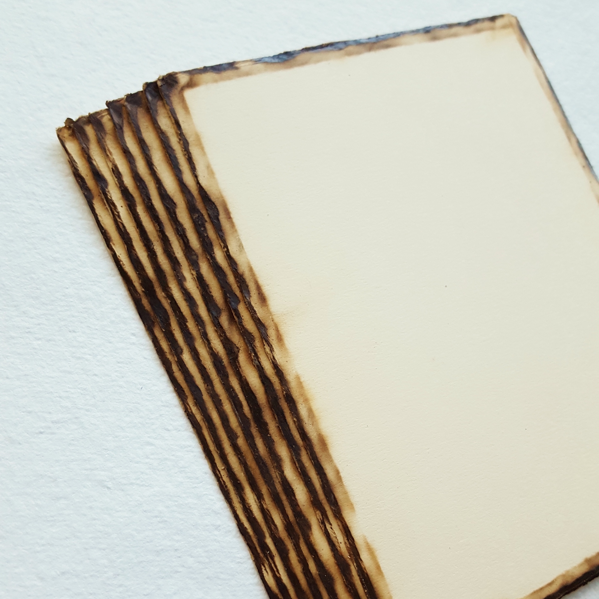 Today, there are many papers available that imitate parchment or have a finish or color to them that lend themselves well to applying a burnt or seared edge to replicate the look of aged parchment.